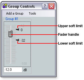 Soft LimitsEach gain control type provides upper and lower soft limits that can be used to limit the range of the group master control. When you create a group master, these soft limits default to the inherent "hard" limits of that particular control (the upper and lower limits defined by that control). Soft limits can be defined using the following methods.