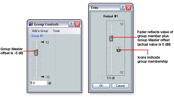 Group MembersAfter a group has been created, the group members (the individual controls that comprise the group) update to indicate that they are now part of a group. You can individually control group members. This allows for relative levels between group members to be fine-tuned. Group member levels can also be set by a preset recall. DSP Configurator displays the group member value plus the offset created by the group master. As a result, the application always displays the value that you are hearing. However, the value of the group member that is on the device is always the actual value, independent of the added group master offset value. If a group master is deleted, the group member value reverts to its actual value.
