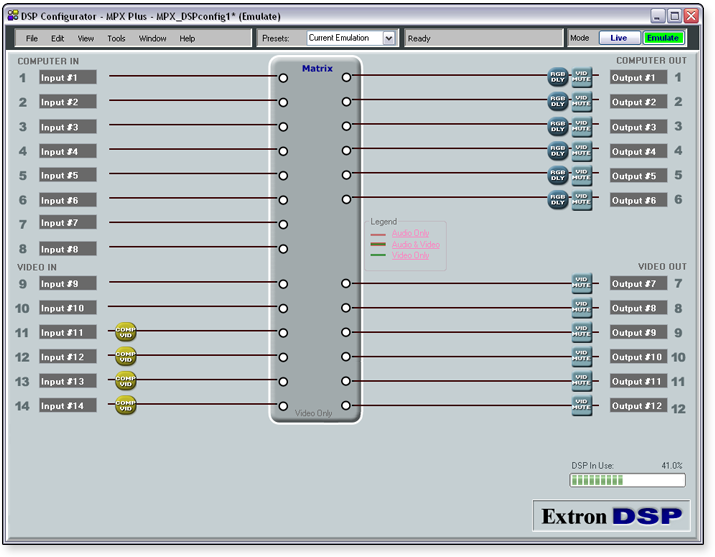 In the Video I/O workspace, you can access the video switching matrix and low-resolution video format selection. You can also access the RGB delay and video mutes. See the Video I/O Workspace subsection of "Workspaces Overview" for more information. |