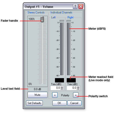 Left-channel and right-channel trim controls have a range of -6 dB to +6 dB and can be adjusted in 0.1 dB increments. You can adjust the trim controls by clicking the Up and Down Arrows or entering the desired value in the respective Trim field. Trim control adjustment accelerates in two stages when you click and hold the Up or Down Arrow. The default setting is left channel and right channel unmuted at unity gain (0.0 dB). To adjust the fader level: